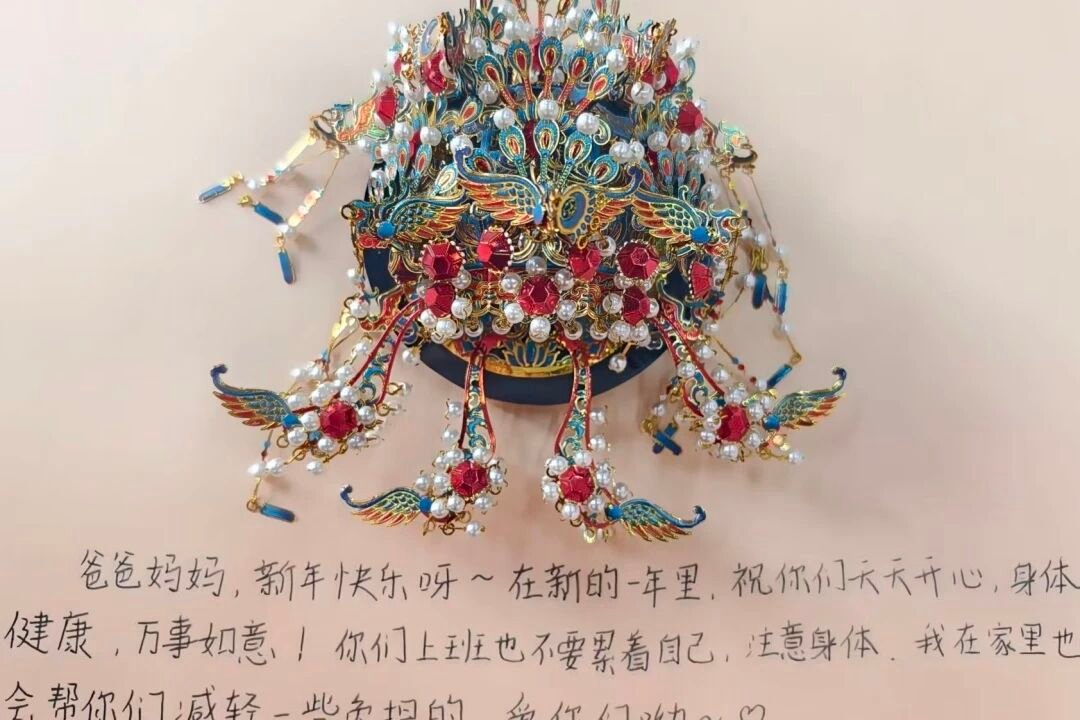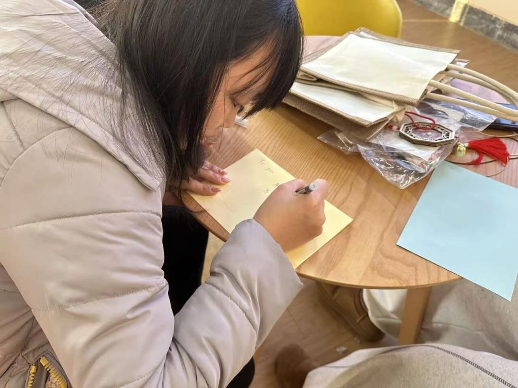 为促进情感传递,活动特别设置“心愿彩卡”环节。同学们在彩卡上写下新年心愿、对家人的感恩与祝福,使非遗作品成为连接家人与校园的情感纽带。活动结束后,大家将手作与彩卡一同带回家中,与亲人分享这份承载文化温度的新年礼物,实现校园文化与亲情关怀的双向奔赴。