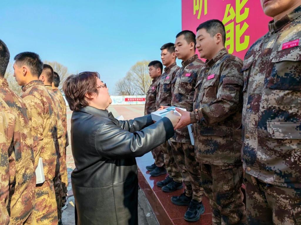 柴娜娜书记代表学校党委向新兵赠送纪念品并讲话。她向全体入伍新兵致以热烈祝贺和崇高敬意,指出参军入伍是青年学子响应国家号召、投身强军事业的光荣选择,是学校践行立德树人根本任务、深化国防教育与思政育人成效的生动实践。柴书记向新兵们提出三点殷切期望:一是铸牢忠诚品格,坚定理想信念,始终听党指挥、忠诚报国,把个人理想融入强国强军伟大征程;二是锤炼过硬本领,砥砺血性担当,在军营大熔炉中刻苦训练、百炼成钢,努力成长为“有灵魂、有本事、有血性、有品德”的新时代革命军人;三是严守纪律规矩,牢记母校嘱托,以优异成绩为军旗增辉,用青春热血守护家国安宁,争取早日建功军营、为校争光。